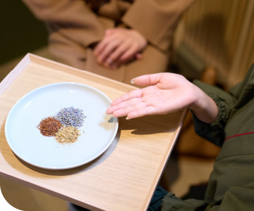 お客様の好みや体調、気分に合わせてよもぎやハーブ、アロマをブレンドできます。デトックス効果が高いハーブを選んだり、お好みのアロマを足して身体だけでなく香りからもくつろげるブレンドをすることが可能です。お客様一人ひとりに合った贅沢な時間を提供することを大切にしています。