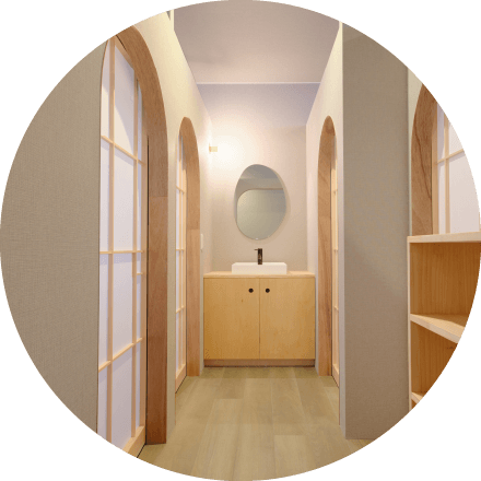 さくらいろは、「和」と「北欧」を融合させた内装となっております。自然素材を取り入れた落ち着いたインテリアと、シンプルで機能的なデザインが調和し、心地よい空間を提供しております。
